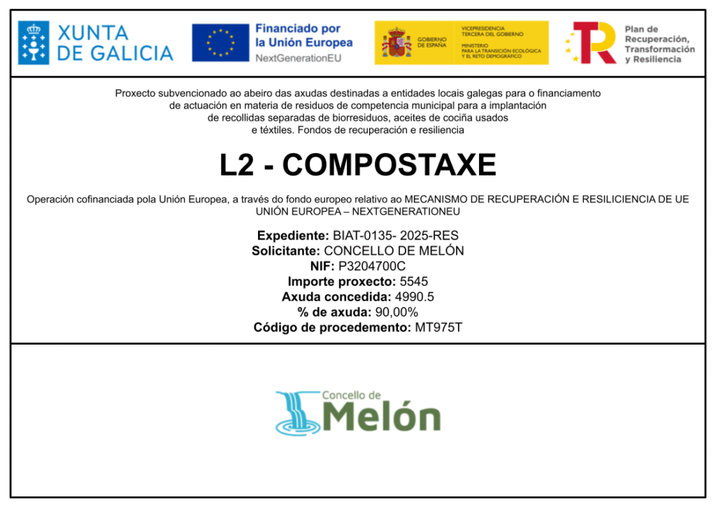 O CONCELLO DE MELÓN resultou beneficiario das axudas destinadas a entidades locais galegas para o financiamento de actuacións en materia de residuos de competencia municipal para a implantación de recollidas separadas de biorresiduos, aceites de cociña usados e téxtiles. Fondos de recuperación e resiliencia na actuación L2 – COMPOSTAXE, cunha axuda concedida de 4990.5 no procedemento MT975T. Sendo esta unha operación cofinanciada pola Unión Europea, a través do fondo europeo relativo ao Mecanismo de Recuperación e Resiliencia da UE — NextGenerationEU.