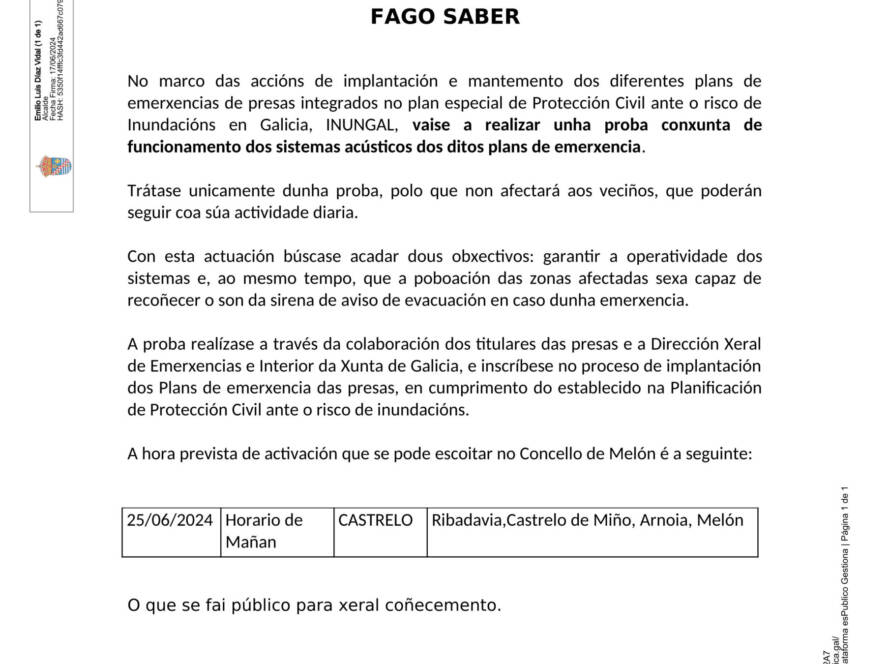 Uncategorizedjulio 11, 2025BANDO: Vaise a realizar unha proba conxunta de funcionamento dos sistemas acústicos dos plans de emerxencias por inundación das presas (INUNGAL)