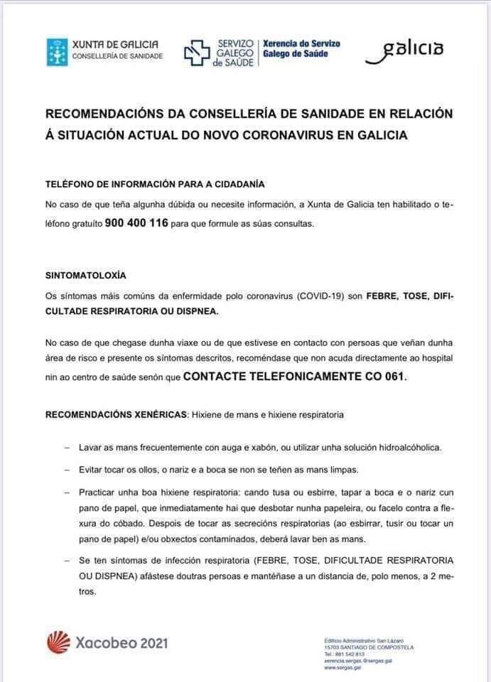 Dende o Concello queremos pedirvos a todos ser disciplinados e establecer os minimos de medidas preventivas a nivel persoal, asi como seguir as recomendacions que se nos estan indicando dende a administracion.